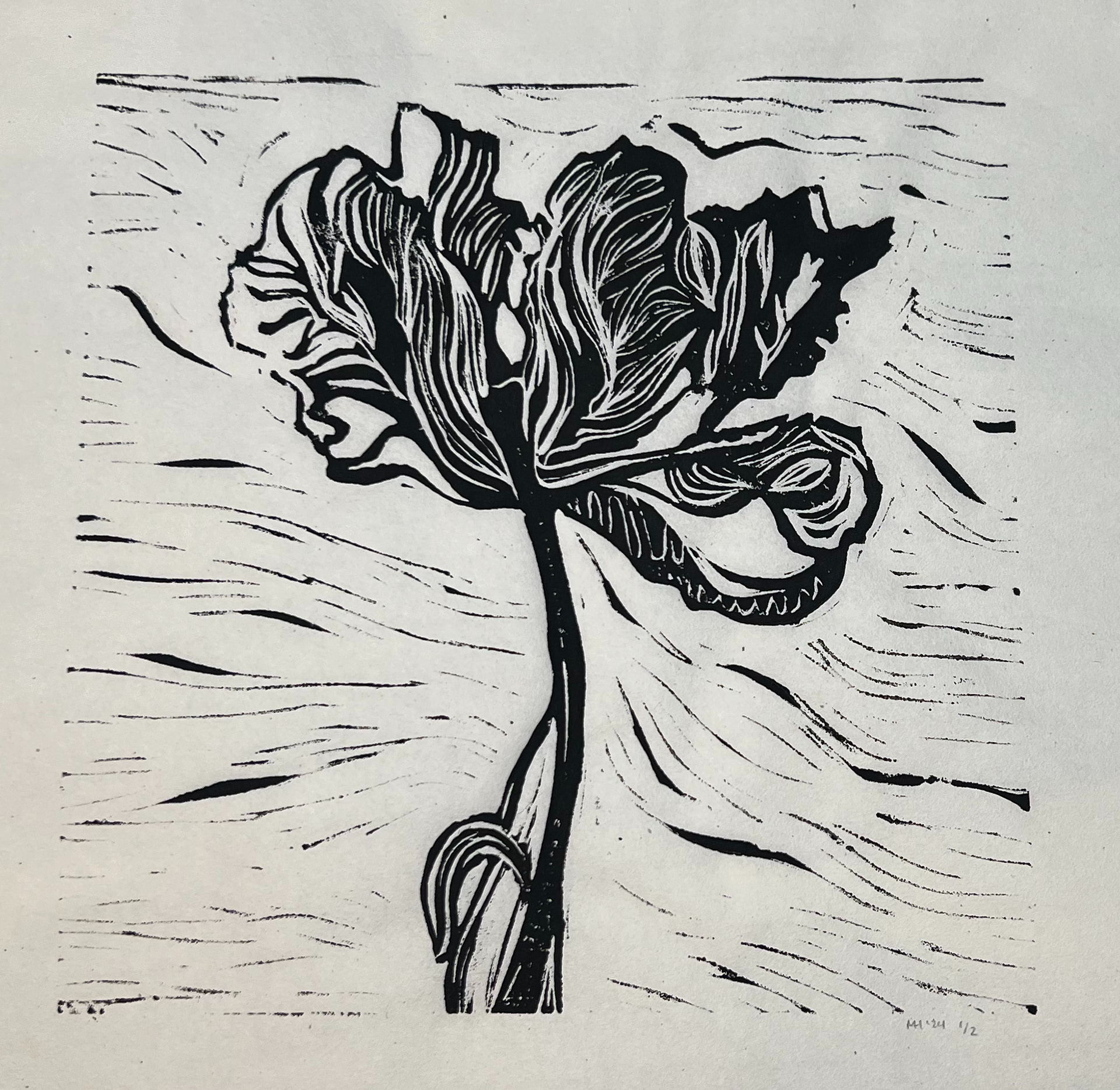 10" x 10" hand-carved linoleum ink print of a flower (April 2024)